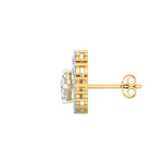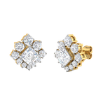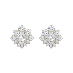 These stunning earrings feature a bold princess-cut diamond at the center, surrounded by a radiant cluster of round brilliant stones in a floral-inspired setting. Each diamond is prong-set to maximize brilliance, creating a three-dimensional shimmer from every angle. The symmetrical design offers classic elegance with a touch of vintage charm. Crafted for maximum sparkle, they bring timeless sophistication to bridal and occasionwear looks.