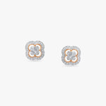 Four-petal charming Stud Earrings in 18 Karat yellow gold frames a baguette diamond centre with a cushion silhouette, finished with a shimmer of natural diamond pav.
