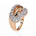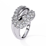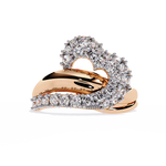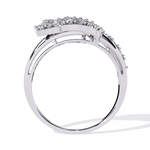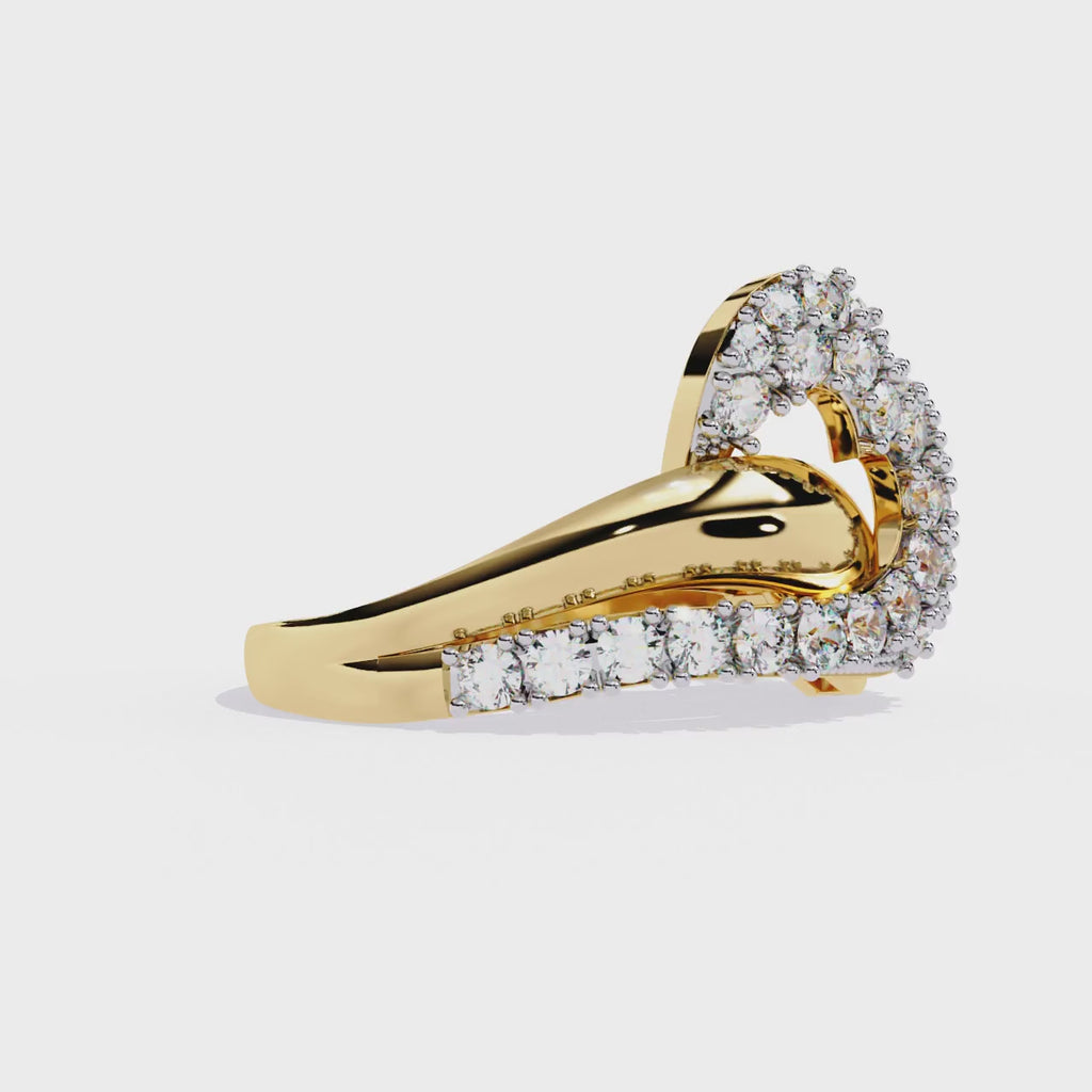A sweeping crescent of diamonds curves gracefully around the finger, creating a unique heart-inspired silhouette.